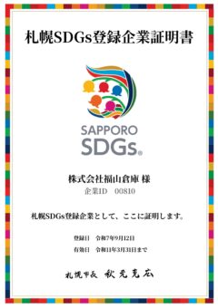 札幌SDGs企業登録について 2025年09月17日 この度、札幌SDGs企業に登録されました。 これからもSDGsの活動に積極的に取り組んでまいります。 登録企業詳細「株式会社福山倉庫」 | 札幌SDGs企業ポータルサイト